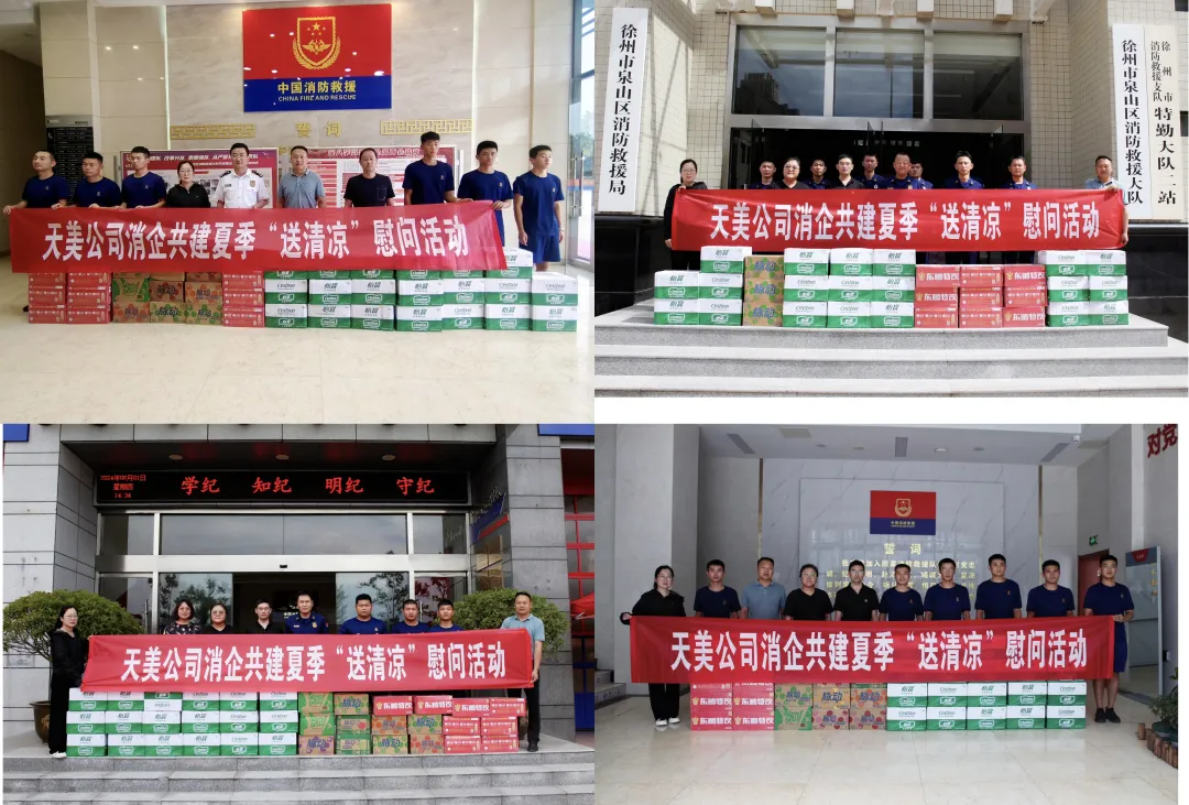 在“八一”建军节来临之际,徐州市天美后勤服务有限公司慰问组前往鼓楼区、泉山区、云龙区、云龙湖景区消防救援大队,为在炎炎夏日下坚守一线岗位的消防救援官兵送去一份“清凉”物资。天美公司党支部委员、副总经理祝国磊带队,相关部门负责人及项目负责人参加此次活动。