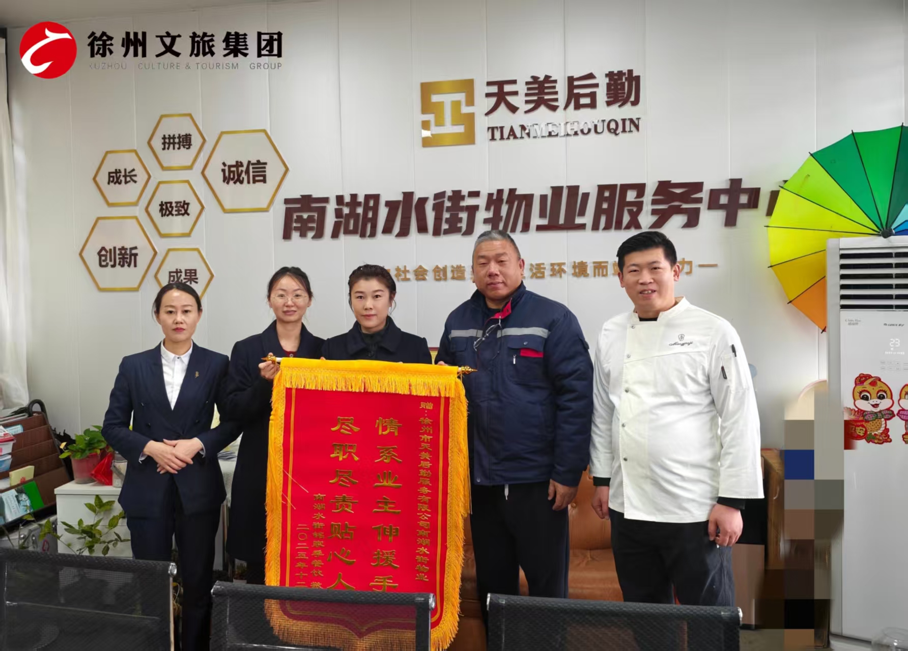 近日,徐州市天美后勤服务有限公司南湖水街物业项目部收到了一面来自街区6号楼铭家季酒店的锦旗。锦旗上“尽职尽责贴心人,情系业主伸援手”的金色大字,不仅是对物业工作的真诚认可,也凝结着一段暖心服务的真实故事。