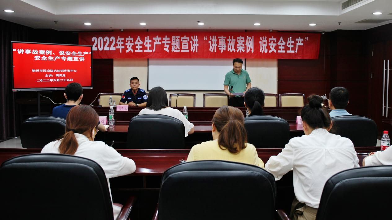为认真贯彻落实“安全生产月”活动精神,进一步宣传党和国家‍‍‍‍‍‍‍‍有关安全生产的法律法规、方针政策,普及安全生产知识,营造全社会普遍关注安全生产的良好氛围,增强全民安全意识和应急处置能力。6月29日下午,天美(天勤)公司围绕今年安全生产月活动主题“遵守安全生产法  当好第一责任人”,筹划开展了“讲事故案例 说安全生产”主题宣讲活动。公司主要负责人、分管负责人、各部门(副)经理、子公司负责人、专(兼)职安全员30余人参会,活动由天美公司安全品控部副经理王广柱主持,特邀请徐州市民安防火知识咨询中心资深讲师胡青龙主讲。
